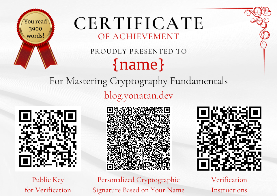 Congrats on making it through the post! To commemorate this accomplishment, I would like to present with your own personalized diploma (including a scannable cryptographic signature of course 🤓). Click here to generate it: